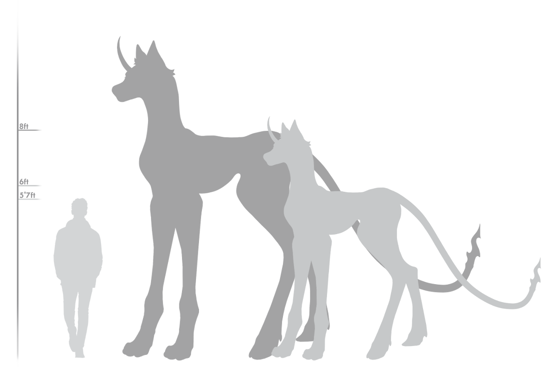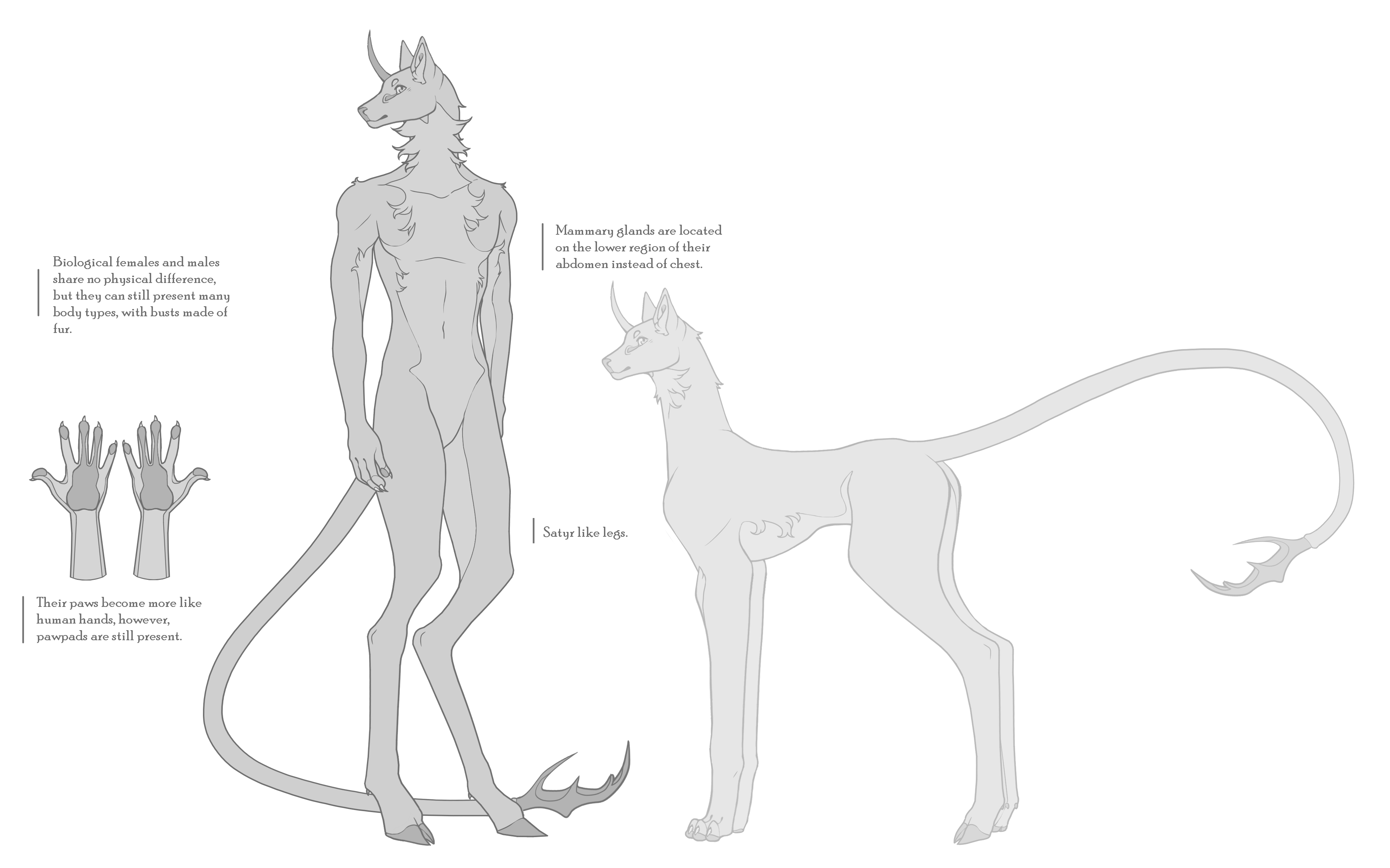 So, what exactly is the Mirrored Dimension? It's a copy of the Corceïs world where almost everything is the same! The difference? They are anthro or humanoid only! below, you can see examples of how they would look in such versions. Their anatomy does change, but their main features, such as long tails, scent glands, paw pads (anthro), etc, are still present! Anthro and Humanoid cors are taller than their feral version; their height is around 9ft to 11ft (from hoof to shoulder).