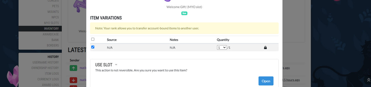 ● Step 2: After getting your brand new MYO slot, you will head up to your Inventory, select the MYO slot, click Use Slot, and then Open.