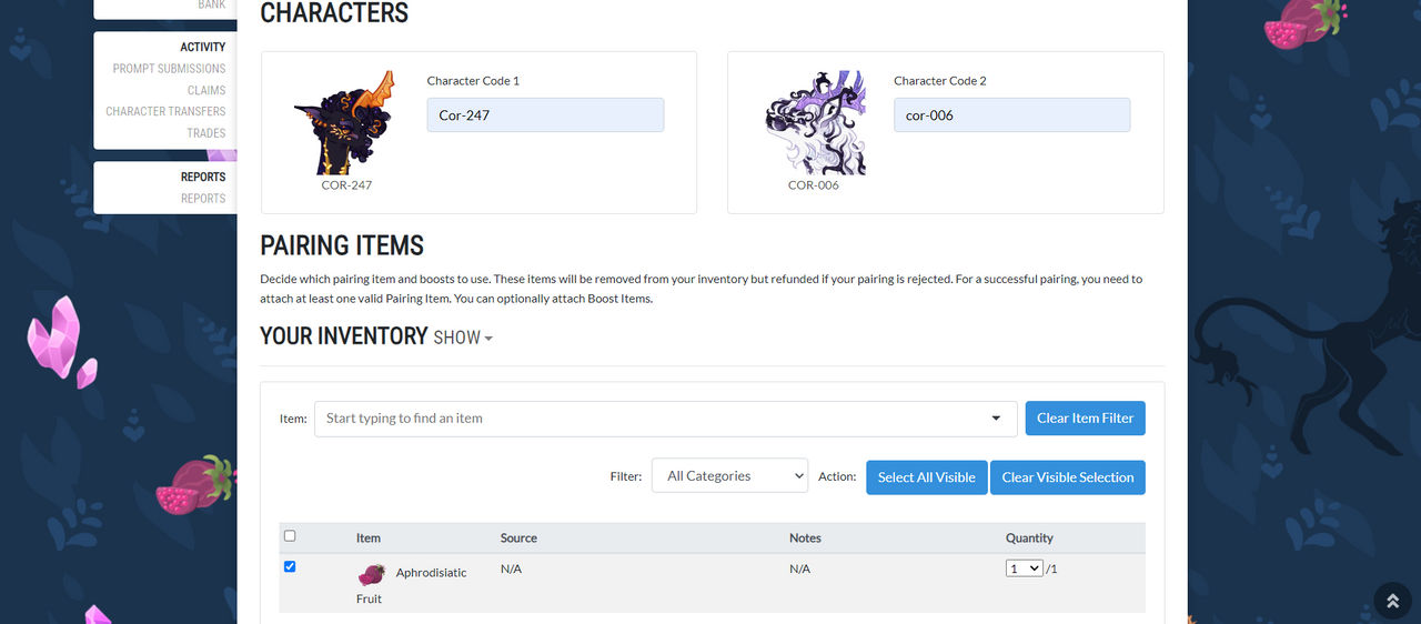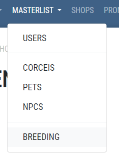 ● Step 2: Now, click on Masterlist and then Breeding! It will take you to My Pairings, and from there you will fill in all the needed info (The code of each cor can be found on their masterlist, being the first 3 letters and 3 numbers!) and then hit submit! You must have the Aphrodisiatic fruit selected.
